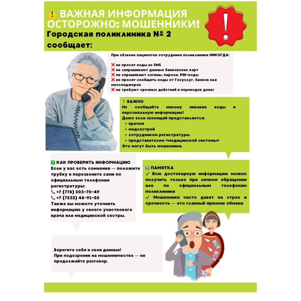 📞 Если вам поступил подозрительный звонок — прекратите разговор и проверьте информацию самостоятельно по официальным телефонам регистратуры: