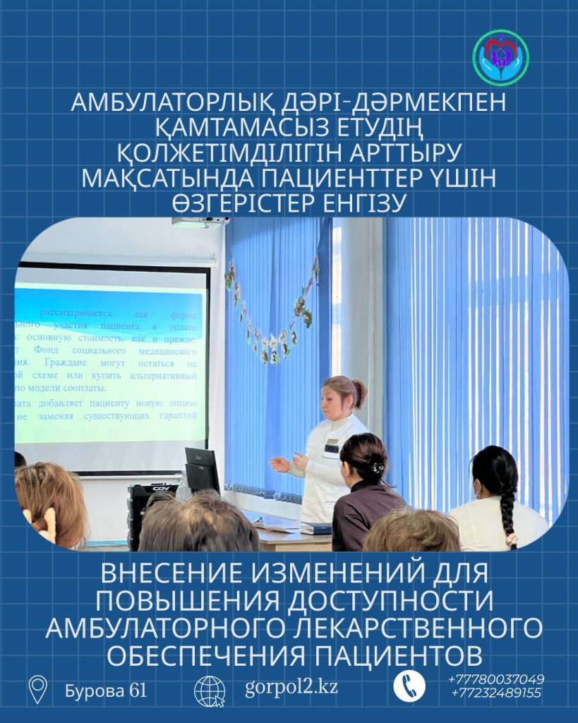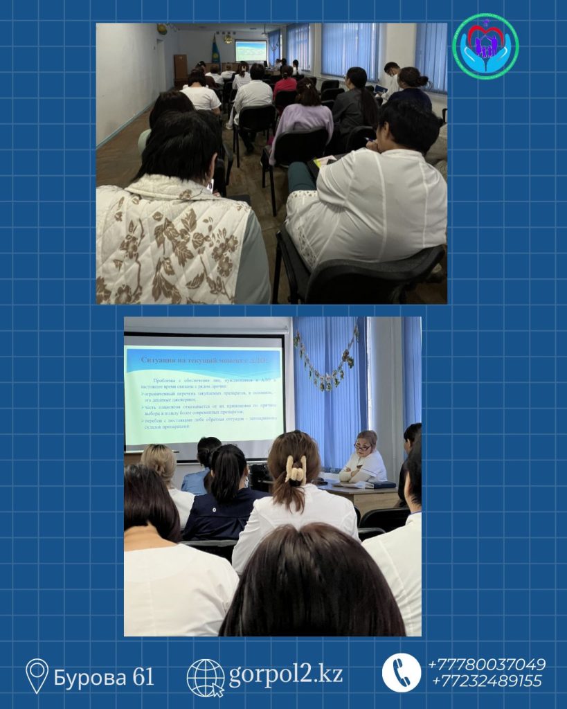 Пациенттерді амбулаторлық дәрі-дәрмекпен қамтамасыз етудің қолжетімділігін арттыруға бағытталған өзгерістер аясында № 2 қалалық емханада медицина қызметкерлеріне арналған оқу-оқыту сабағы өткізілді. Сабақ барысында енгізіліп жатқан негізгі жаңашылдықтар, дәрілік заттарды тағайындау және босату тәртібі, сондай-ақ АЛО-ны тәжірибеде іске асыруға қатысты өзекті мәселелер түсіндірілді.